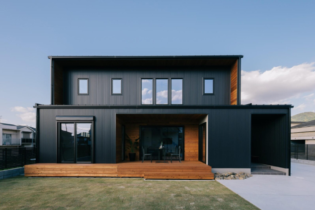 南面大開口のLDKを中心に、各室が緩やかな回遊動線で心地よくつながる住まい。吹き抜けと掃き出し窓が光と風を招き、庭へ続くウッドデッキでアウトドアリビングを満喫。収納も豊富で、外観はは塗装仕上げジョリパッドグレーと印象的な板張りを採用、上質でモダンな印象のお家です。